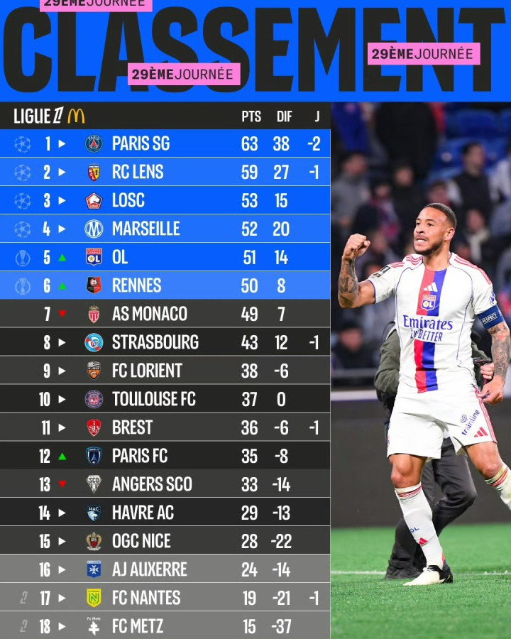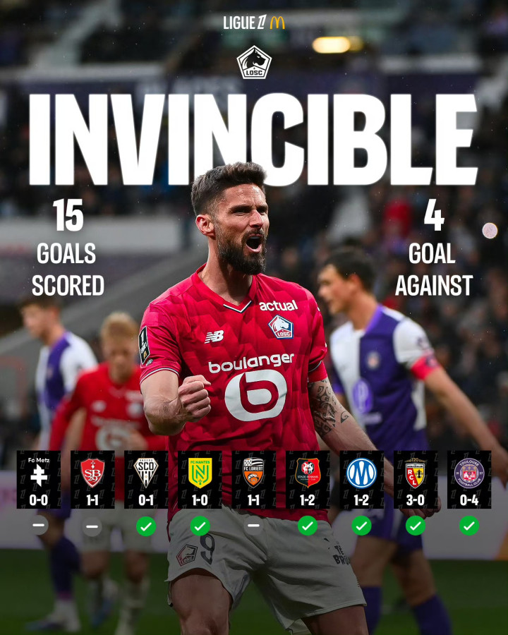 里尔在近9场联赛中取得6胜3平未尝败绩,在积分榜上上升至第三位